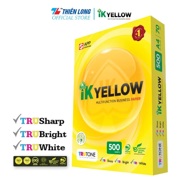- Giấy IK Yellow đa dạng kích thước và định lượng, chất lượng hình ảnh sắc nét và rõ ràng; hạn chế xuyên thấu khi sao chép, in ấn tài liệu. IK Yellow thích hợp in 2 mặt và là sự lựa chọn lý tưởng cho hầu hết các thiết bị văn phòng như máy photocopy tốc độ cao, máy in phun, máy in lazer và máy fax.